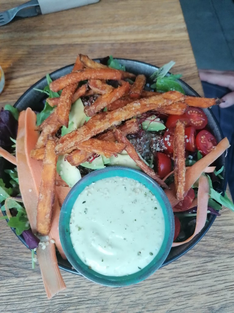 A cute vegan restaurant and cafe with outdoor seating. The vegan burgers and salad bowls were excellent and the staff were friendly. Perfect for any time of the day.